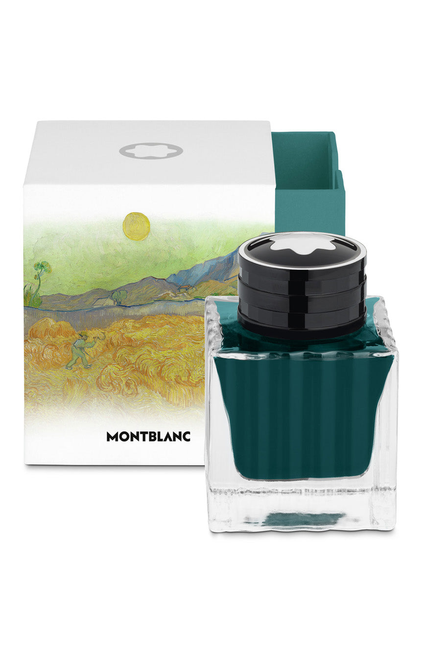 زجاجة حبر مونت بلانك 50 مل، فيروزي، تكريمًا لفنسنت فان جوخ. تأتي زجاجات الحبر الخاصة من مونت بلانك في عبوات مربعة تستحضر مفاهيم وموضوعات كل مجموعة، مما يجعلها هدايا قيمة لمحبي مونت بلانك.