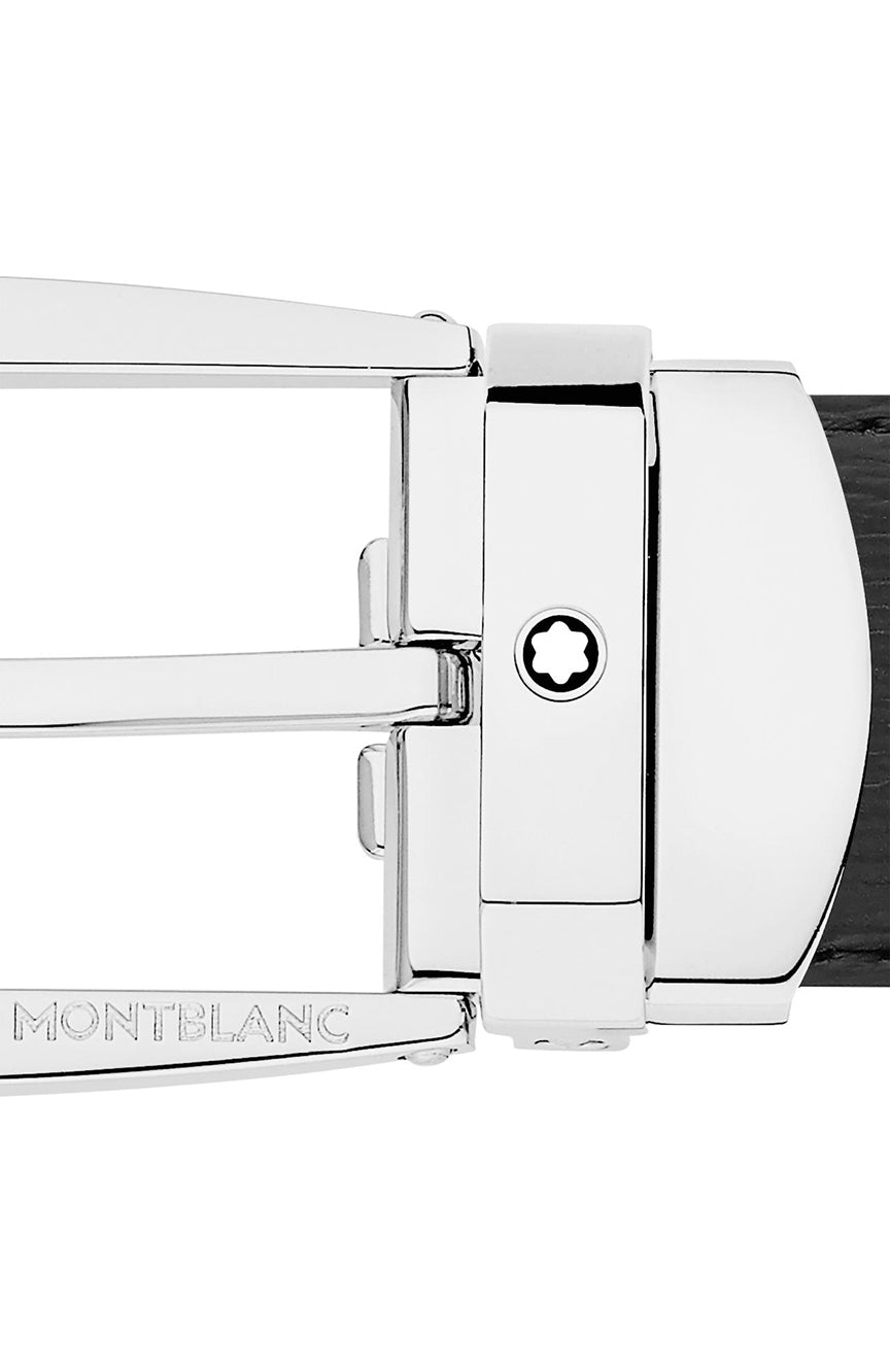 مشبك دبوس لامع من الفولاذ المقاوم للصدأ على شكل شبه منحرف. حزام من جلد البقر الأسود قابل للتعديل ذاتيًا، مقاس 3 سم × 120 سم، مع طباعة مونت بلانك الدقيقة التي تتوافق مع مجموعة 4810 Westside Leather Goods.