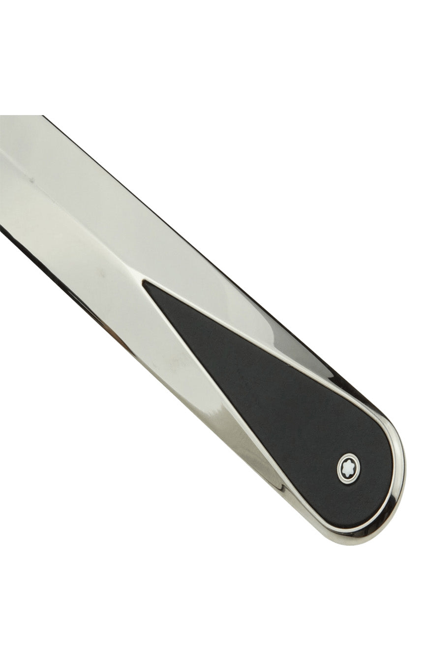 فتّاحة رسائل مونت بلانك مصنوعة من الفولاذ المطلي بالروثينيوم مع تطعيم من جلد العجل الناعم باللون الأسود.